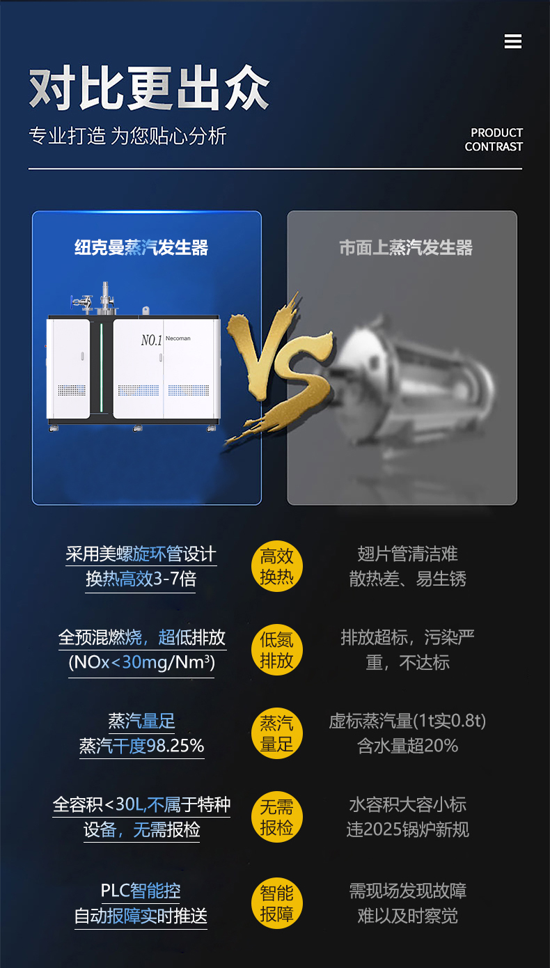 蒸汽量:50kg至6T,無(wú)內(nèi)膽,水容積<29L、產(chǎn)汽快、免報(bào)檢,低氮燃燒NOx排放<22mg/m3,符合環(huán)保要求,310S不銹鋼過(guò)流件直流環(huán)管結(jié)構(gòu),達(dá)到衛(wèi)生級(jí)別,溫度、壓力、可定制,更多參數(shù)可致電15323300918